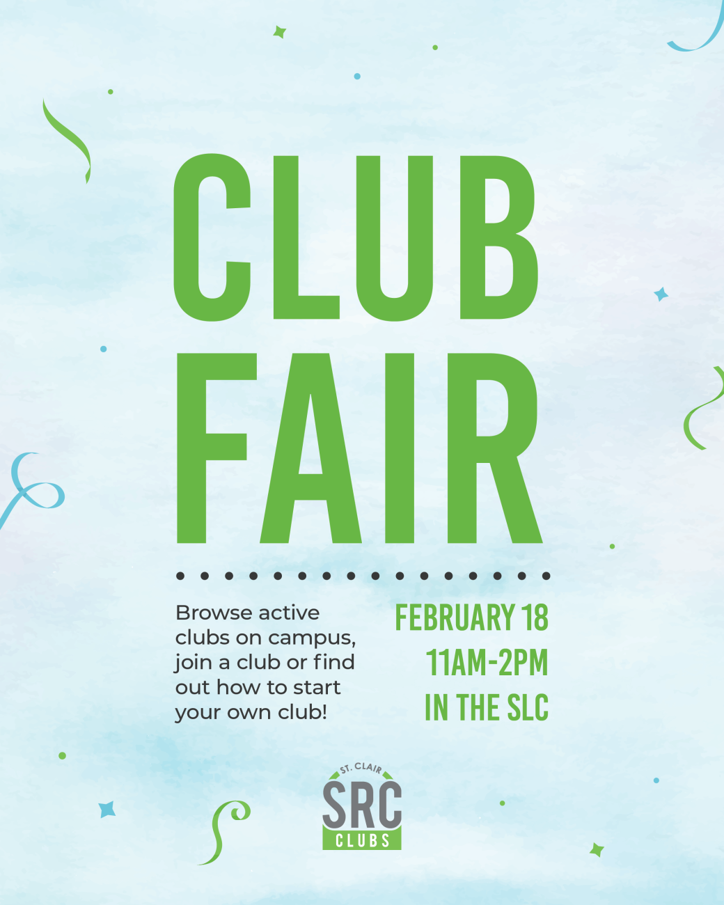 Come out to the Student Life Centre to browse active clubs on campus, join a club, or find out how to start your own club!
